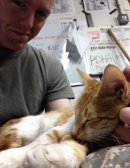 O laranjinha Puff e a tricolor Tigris ganharam a afeição de dois soldados americanos que estavam servindo na base.
